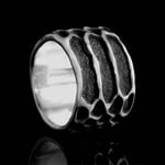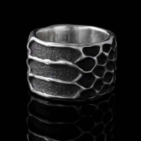 This dramatic, wide band ring is inspired by Snake skin patterns. The Snake is powerfully connected to life forces and primal energy and also represents healing and transformation.