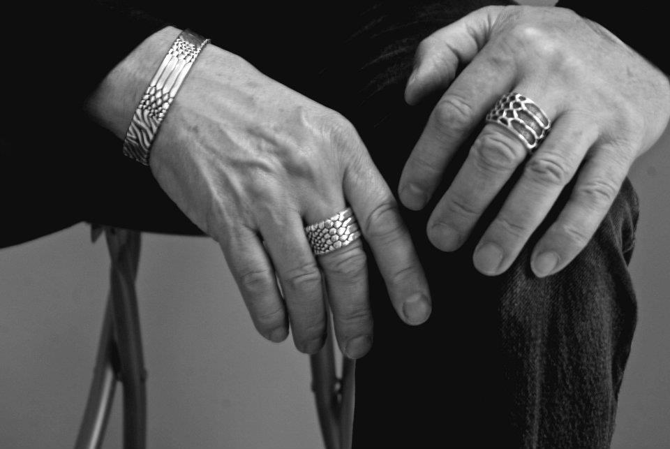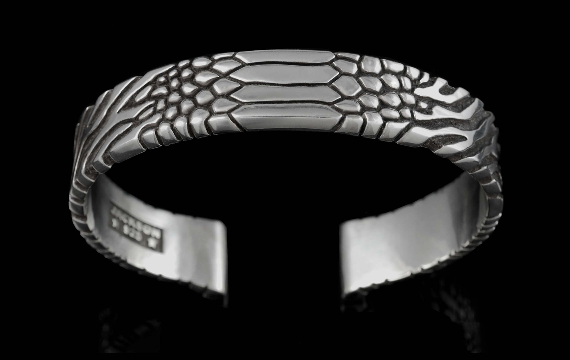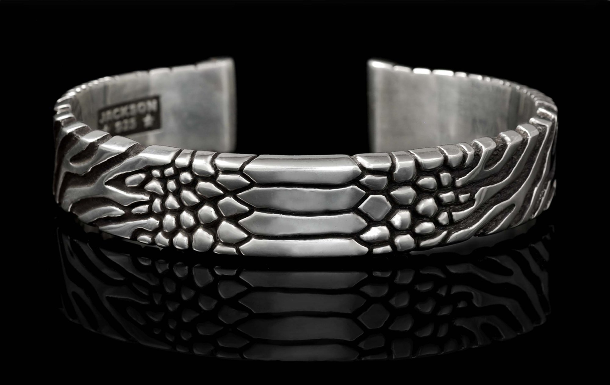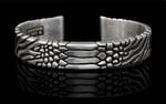 This substantial cuff makes a solid statement with four different animal and reptilian textures blended along its length.